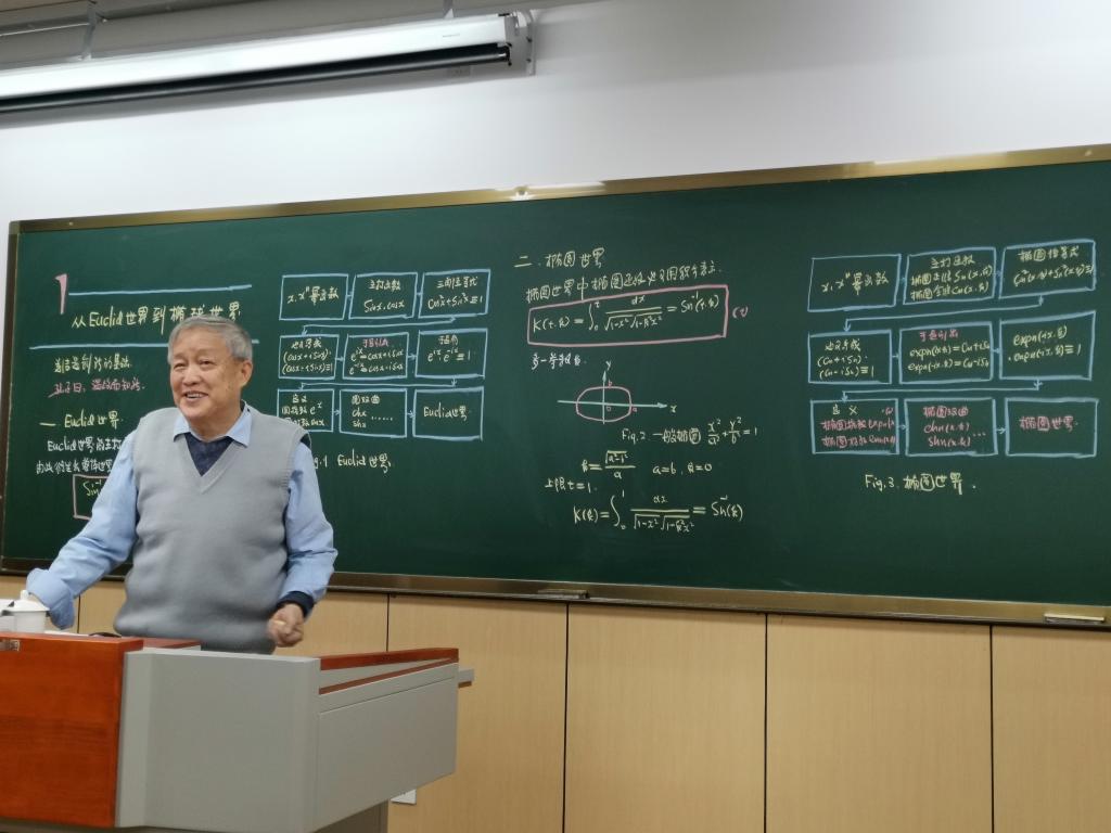据悉,当天上午,梁昌洪教授还为信息色情网站的青年教师和20余名研究生上了精彩的一课 —— 作了题为《从欧几里德世界到椭球世界》的学术报告。报告提出了椭球世界这一概念。从三角函数、椭圆三角函数发展到椭球三角函数,引出各种丰富的函数并构成全新的椭球世界。该报告为我校师生更好地了解世界科研最新动态和成果提供了学术平台,开拓了国际视野。梁教授虽然有多年的授课经验,但仍然保持一丝不苟的教学态度,他的课准备得很充分,全部的教案都是手写完成的,并且不断修正补充实在值得青年教师们学习。在上课时,梁教授垫脚板书,他的板书条理清晰、工整、速度极快,采用多种颜色的粉笔书写,富有美感,示意图、关系图、对比图等简洁明了。整个课程1个半小时,这位年近八旬的古稀老师全程站立着上课,实在让人敬佩,让在座的师生实地体会到了这位名师的风采。