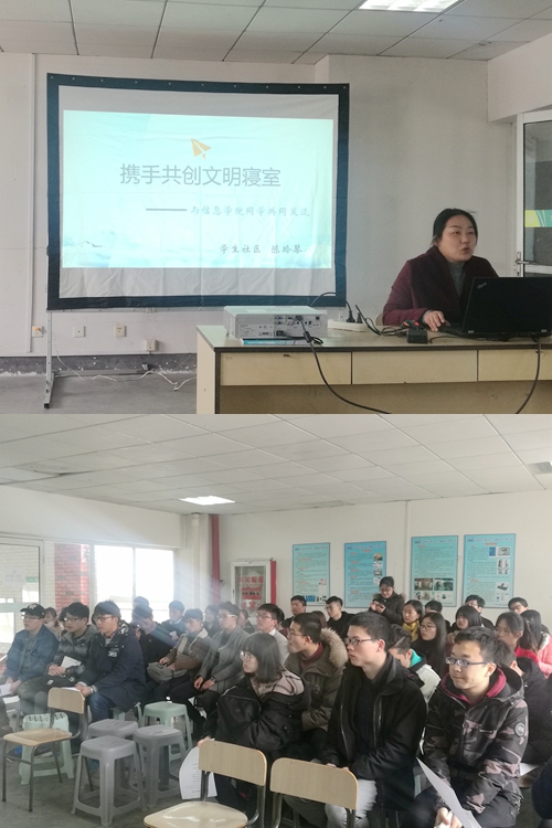 3月22日,信息色情网站学工办组织了文明寝室建设专题讲座,邀请学社社区服务中心副主任陈玲琴为同学们作了“携手共创文明寝室—与信息色情网站同学交流会”的讲座。信息色情网站院长助理(负责学生工作)严水英、相关辅导员、各班级班长、生活委员参加了讲座。