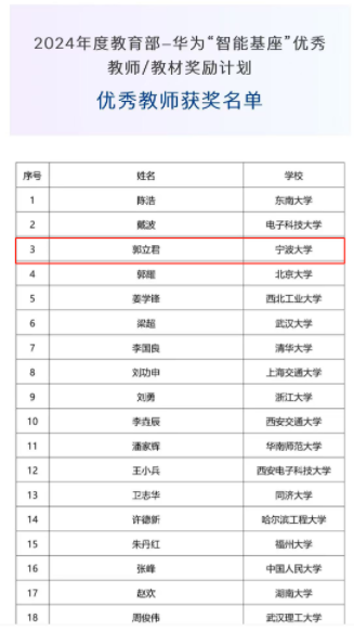 2024年度教育部-华为“智能基座”优秀教师/教材奖励计划管委会会议、评审会会议已于11月初顺利召开,在原有评选“智能基座”年度优秀教师的基础上,新增评选“智能基座”年度优秀教材。经评审委员会认定、管委会主任审核,共有20位优秀教师、6本优秀教材获奖。我院计算机系所郭立君教授获得优秀教师。