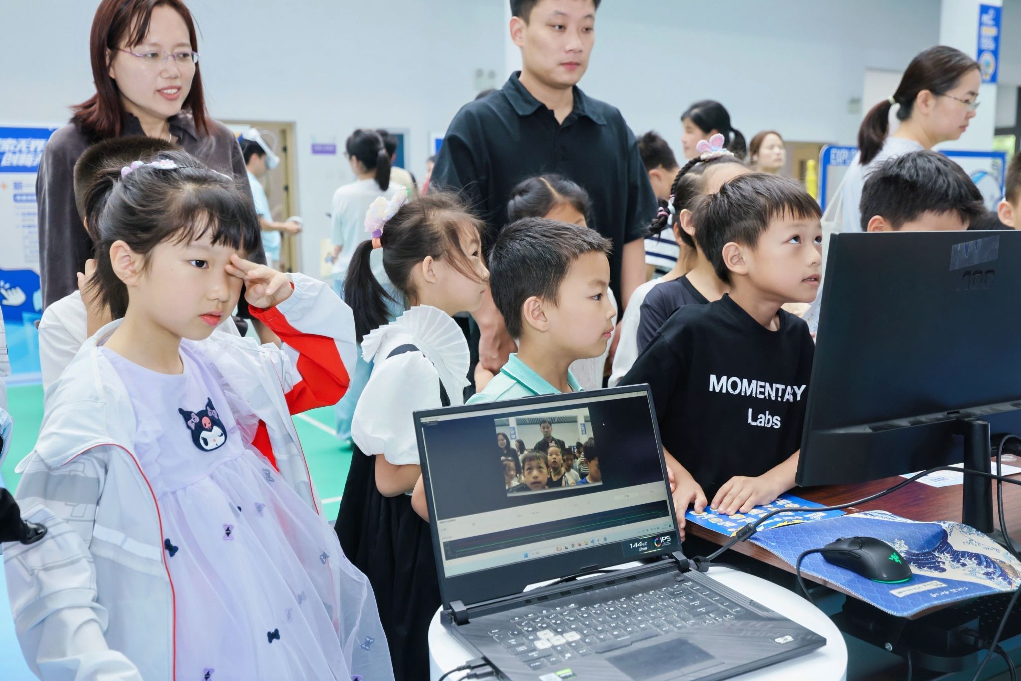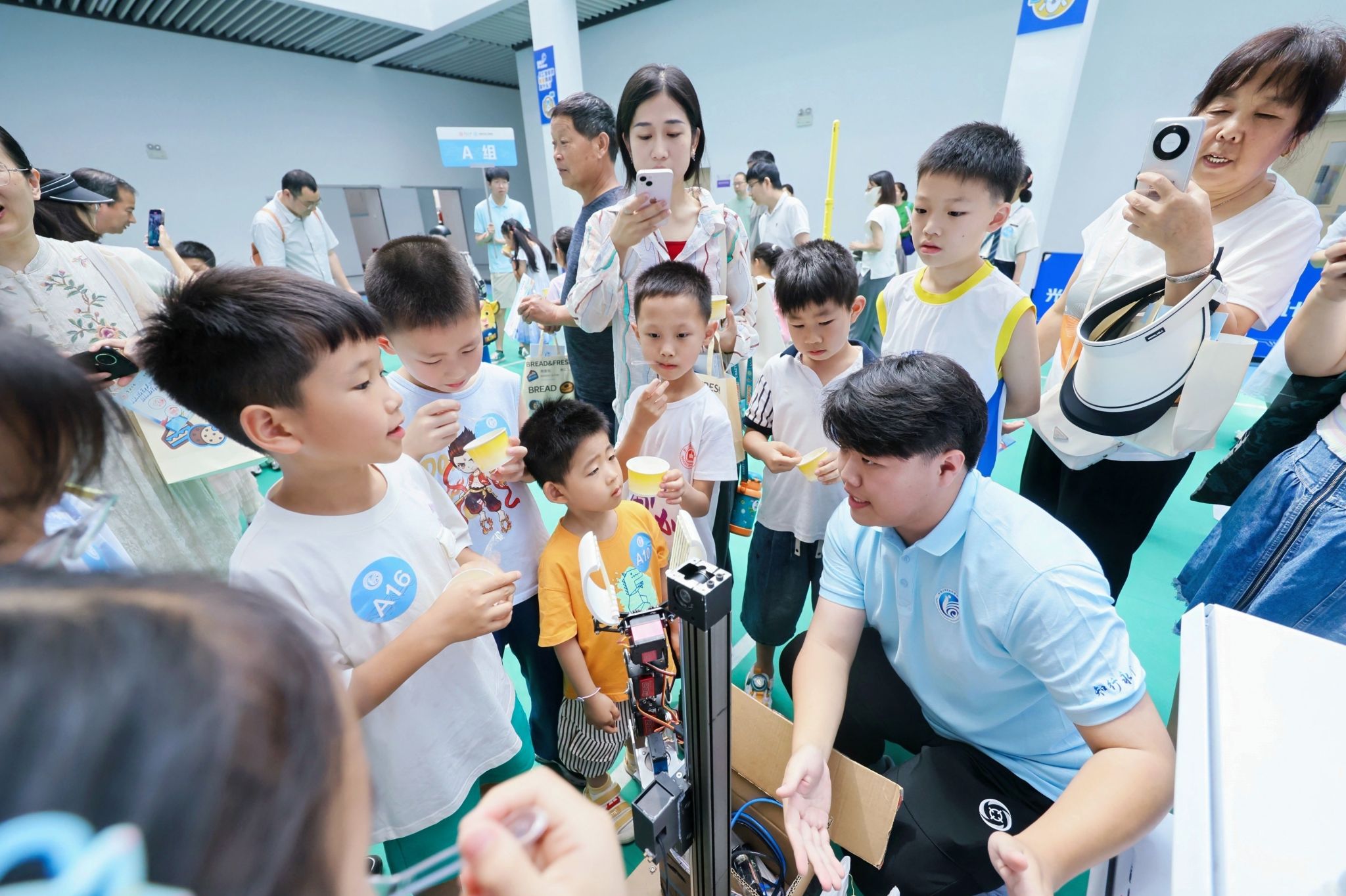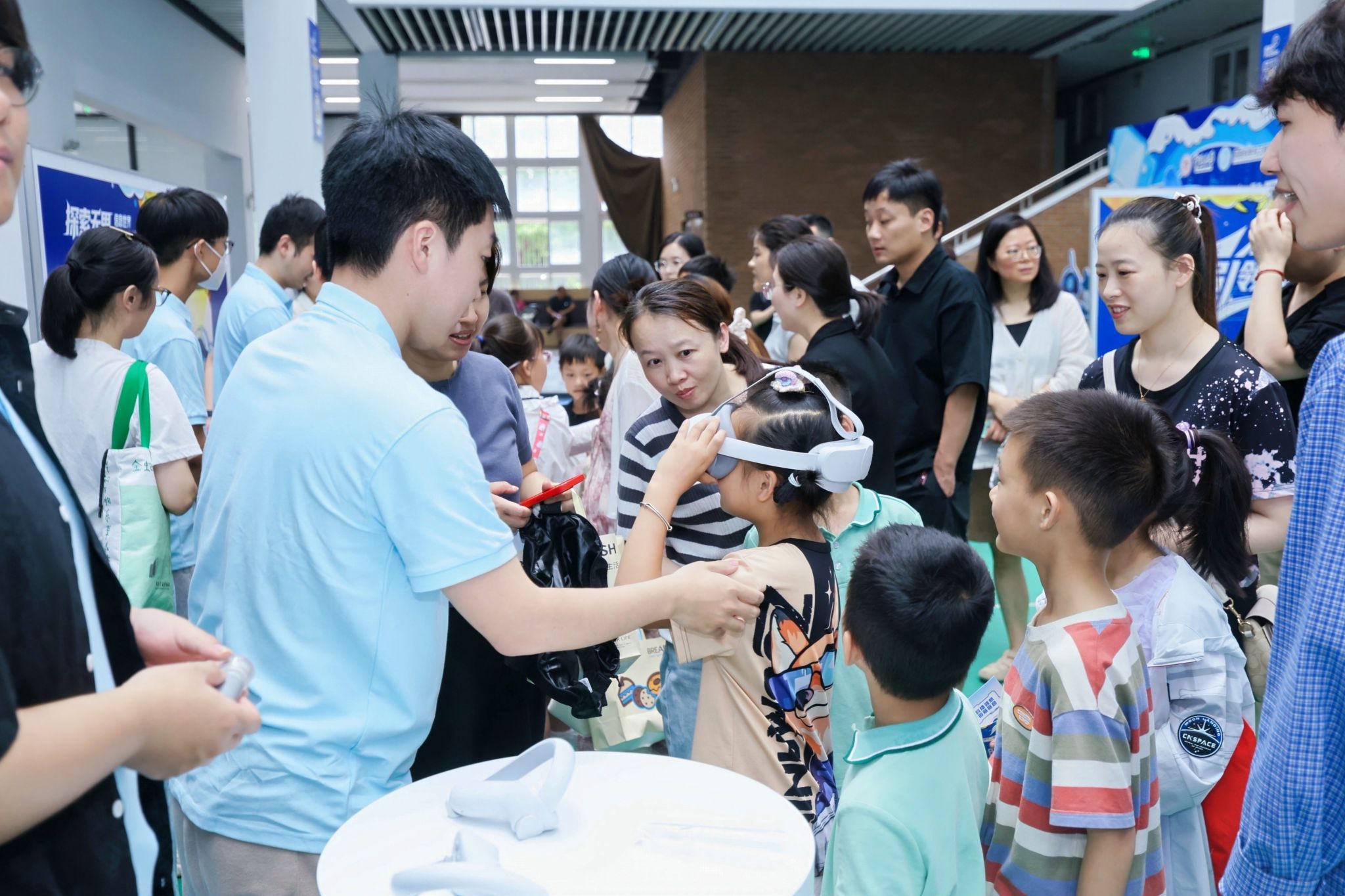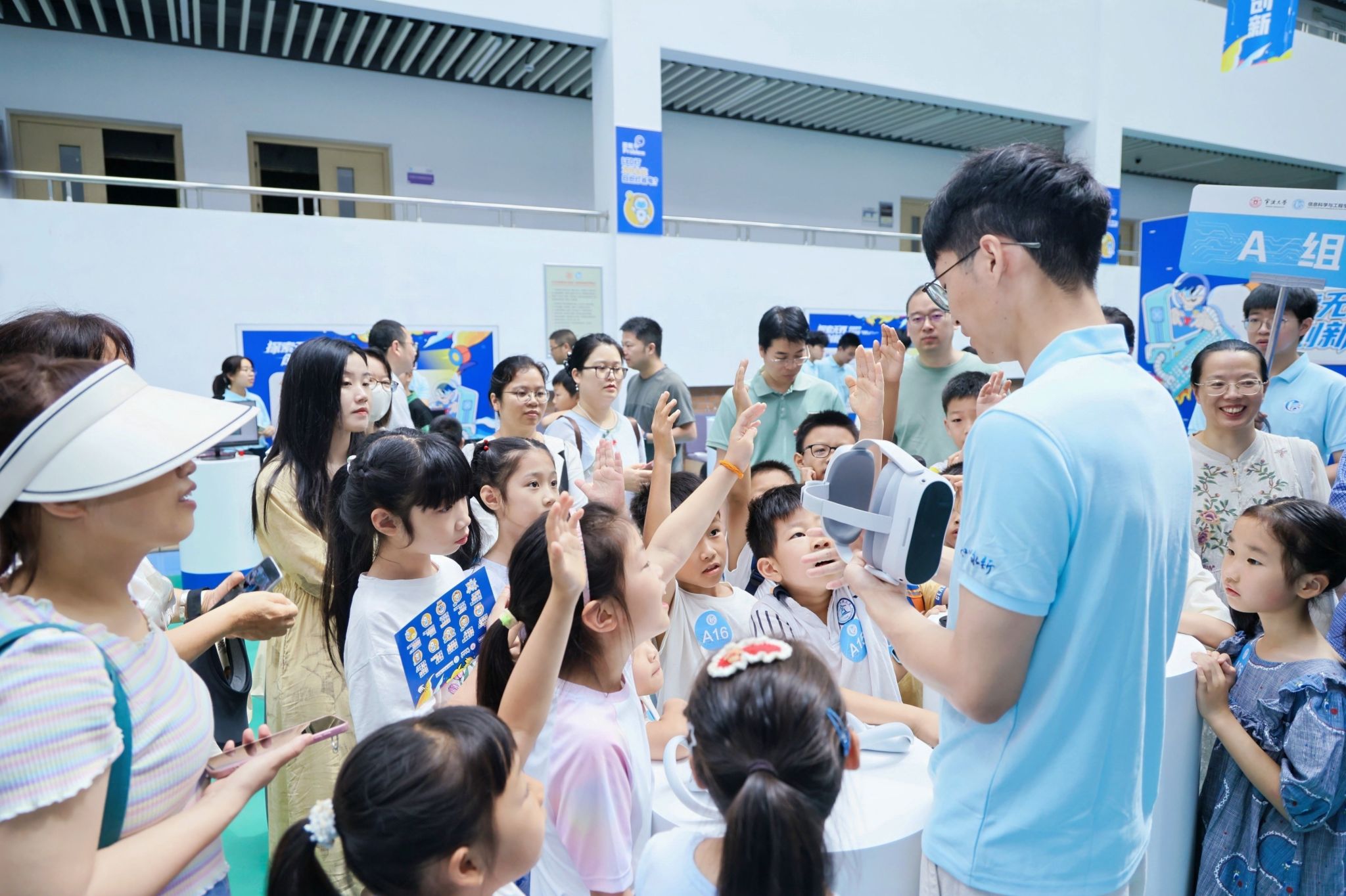 在展厅参观环节,孩子们在专业老师的带领下,走进“信息世界探索中心”,通过电子放大镜观察芯片内部结构,体验3D打印技术、AI垃圾分类和VR眼镜等前沿科技,初步领略了信息科学的魅力。