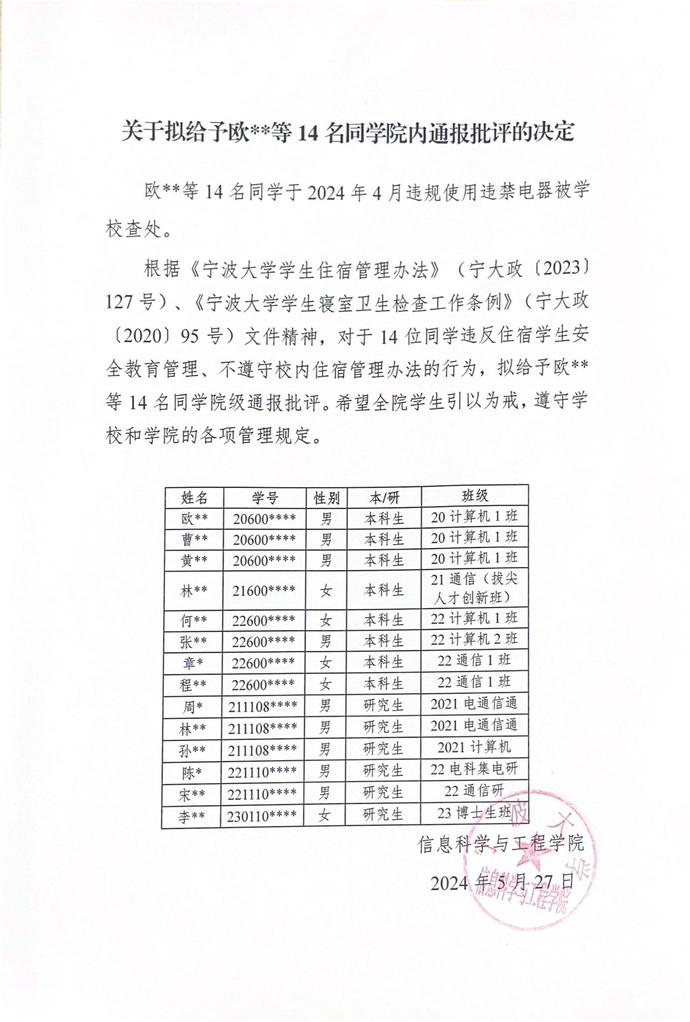 关于拟给予欧**等14名同学院内通报批评的决定