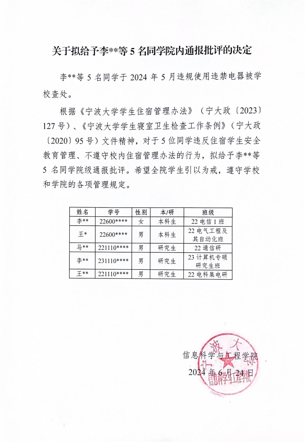 关于拟给予李**等5名同学院内通报批评的决定