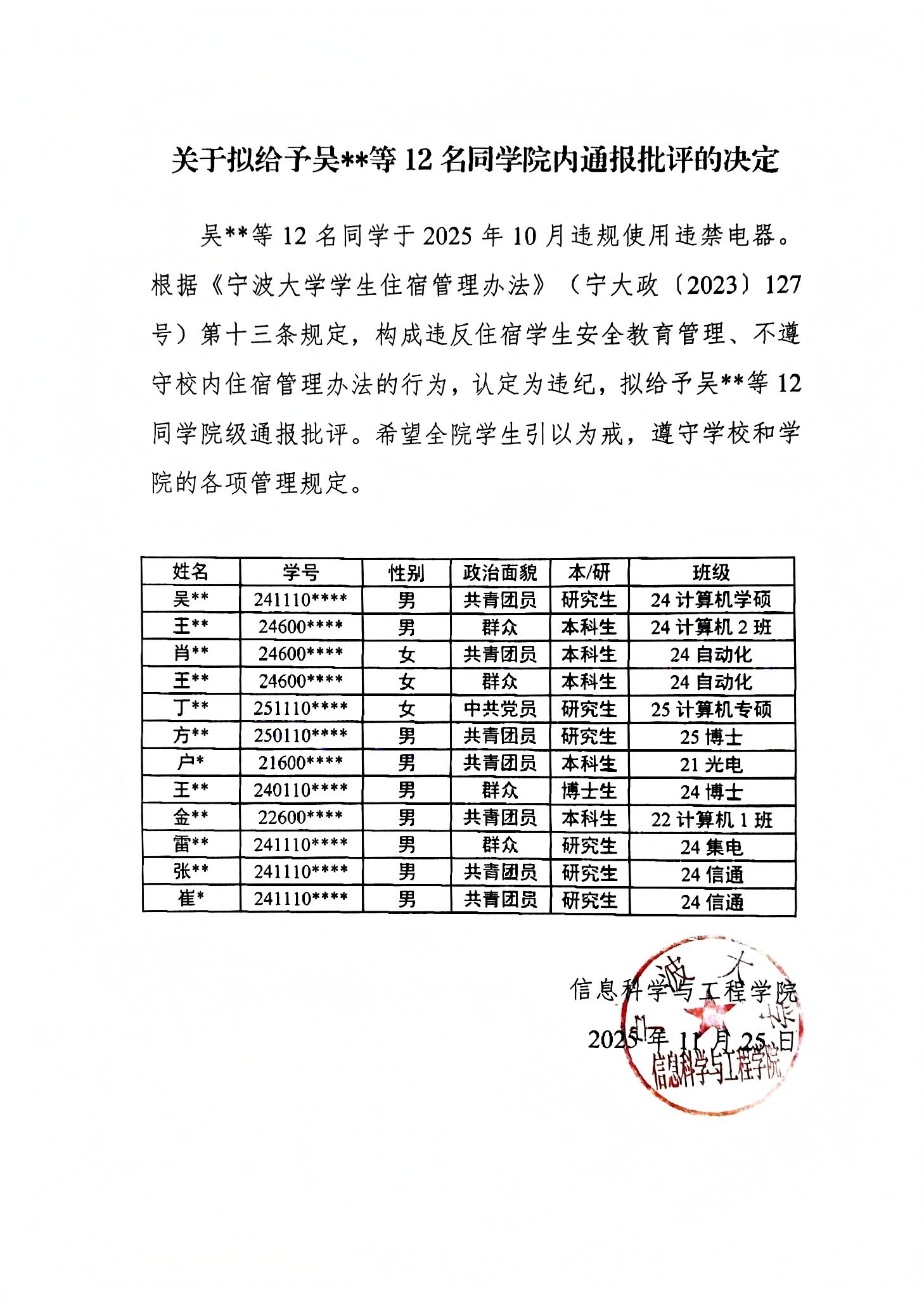 上一条:关于征集信息科学与工程色情网站2026年研究生奖学金评定实施细则、个人荣誉(研究生部分)修订意见及建议的通知 下一条:关于拟给予叶**等10名同色情网站内通报批评的决定