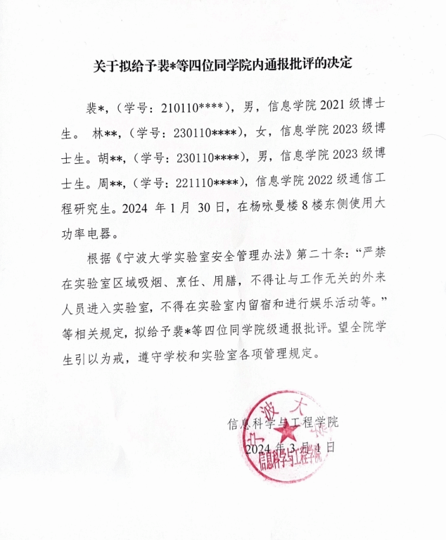 关于给与XX等四位同学院内通报批评的决定