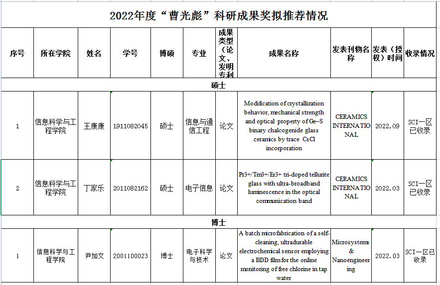 2022年色情网站 研究生科研成果奖申报工作自3月份启动以来,色情网站 广泛动员、严格审查。经前期自主申报,资格审查,共有8名硕士、1名博士申报曹光彪科研成果奖;3名硕士、1名博士申报卓越科研成果奖。经学院研究生奖学金评审委员会全体审议与投票,现将拟推荐学校参评的同学情况做公示,请全院师生知悉。公示期三天,3.28-3.31,公示期间有任何异议请与奖学金评审委员会秘书处联系87600343。