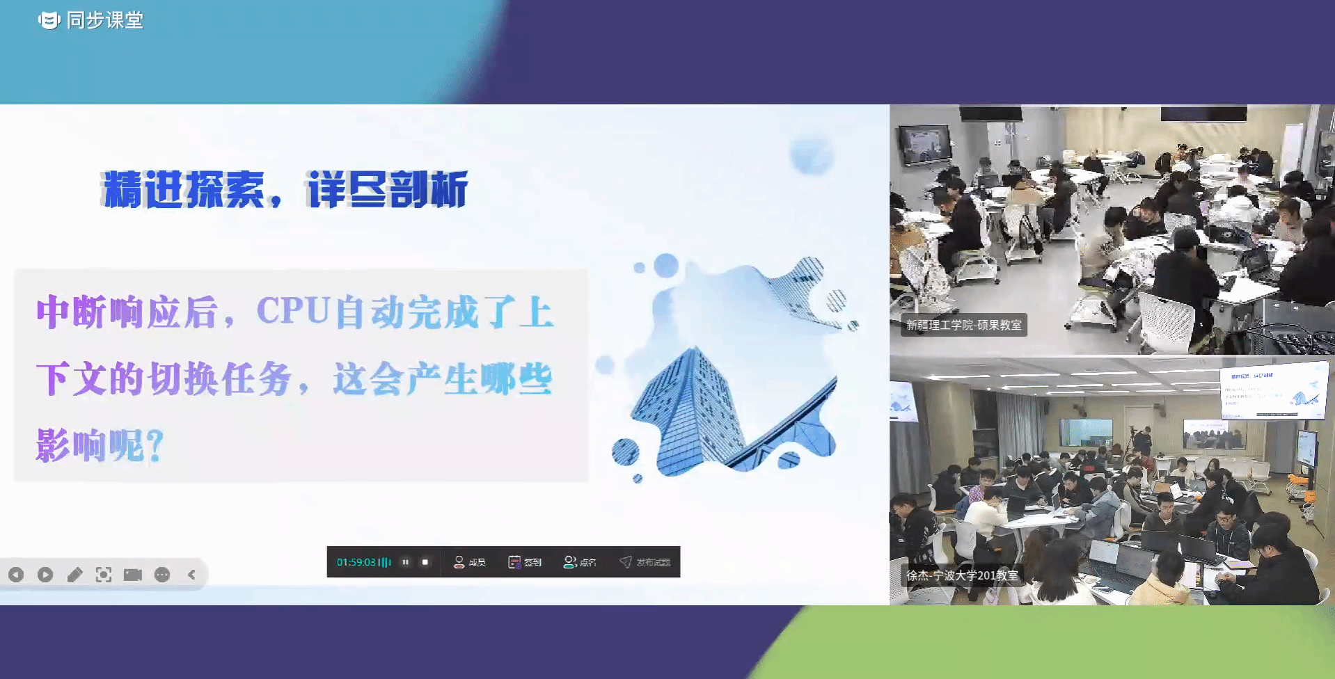 朱莹老师主讲,课程主题“8051微控制器的中断系统”,本次课程初步实践了“AI+专业课”的教学设计,精心设计教学环节。课前布置了预习任务,学生基于知识图谱和AI智能体自主个性化的学习。课中围绕预习内容设置了讨论问题,通过学生的反馈,老师引导学生深入思考中断系统的在嵌入式系统开发过程中的优势。然后通过新的知识点梳理和具体任务实践,引导学生继续思考中断系统在当今物联网、边缘计算、智能终端等领域中面临的主要难题,并结合2024年12月4日燧原智能科技公布的一项名为“一种片上子系统内的中断处理电路、中断处理方法及芯片”的专利,引导学生探索更新解决“中断风暴”的新方法,帮助学生深入思考今后的主要研究趋势。课后,基于智慧课程布置了核心知识点的总结和整理的课后任务,并依据问题图谱布置了结合实际应用的思考讨论问题。通过这样的课程设计,深化了以“学生为主,教师引导”的翻转课堂,同时实现了学生自主学习和个性化需求,以及激发学生探索新技术的渴望。整个课堂充满了严肃活泼的学习氛围,学生线上互动积极,学习兴致高涨,纷纷表示这样的“同步课堂”别开生面、充满新技术、新时代感,期待着下一次同步课堂的交流。