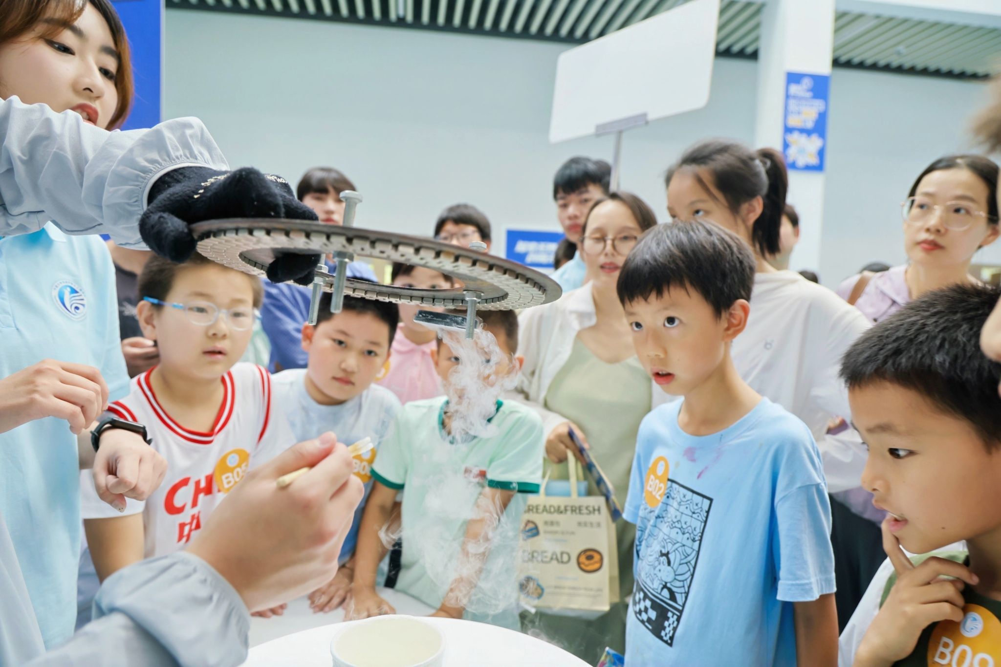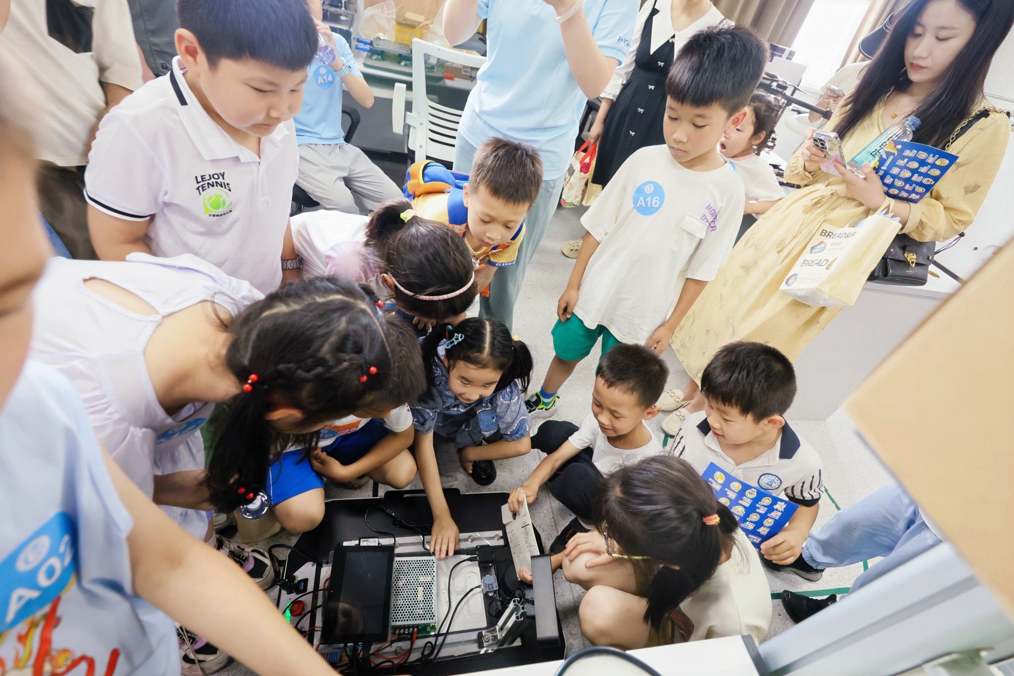 在展厅参观环节,孩子们在专业老师的带领下,走进“信息世界探索中心”,通过电子放大镜观察芯片内部结构,体验3D打印技术、AI垃圾分类和VR眼镜等前沿科技,初步领略了信息科学的魅力。