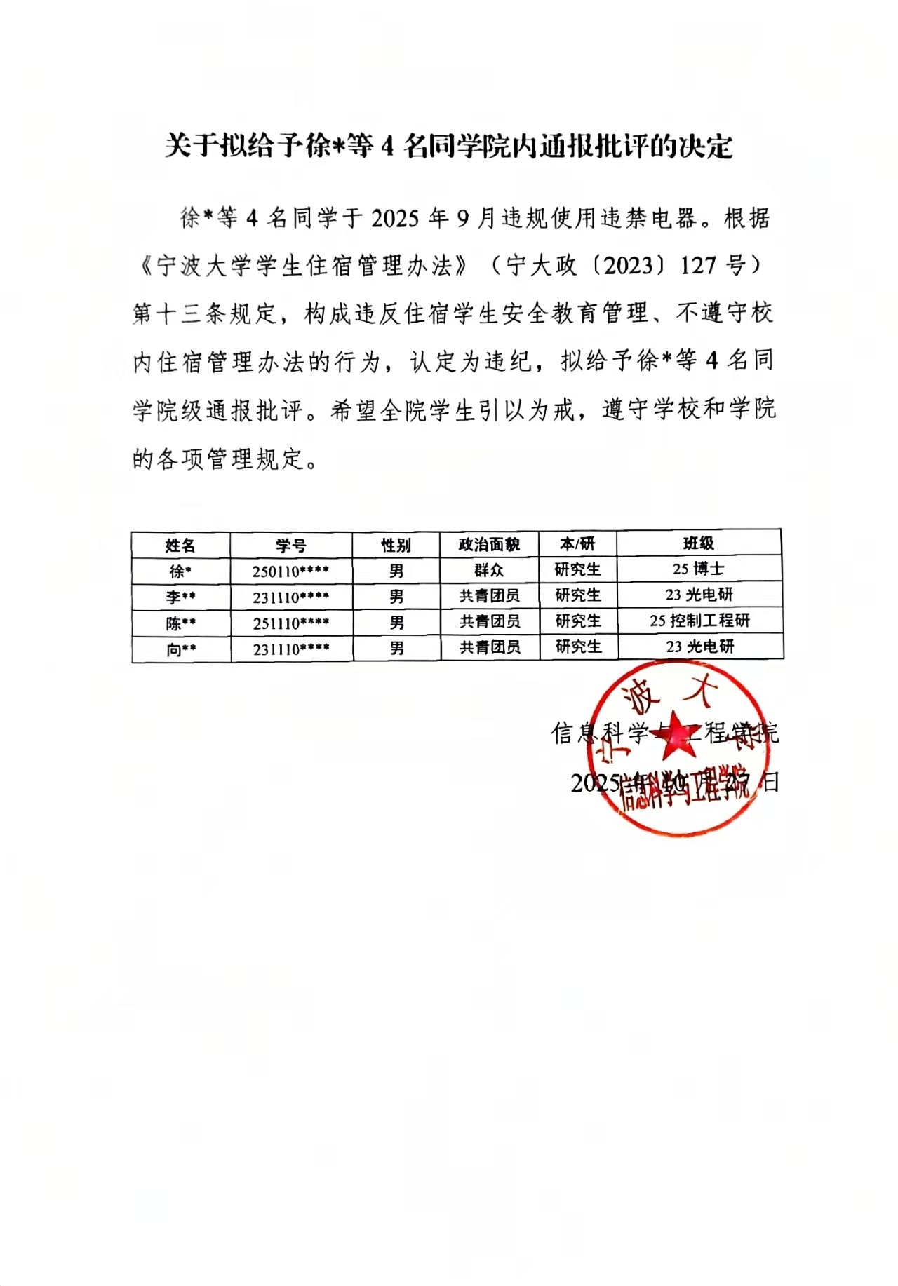关于拟给予徐*等4名同色情网站内通报批评的决定