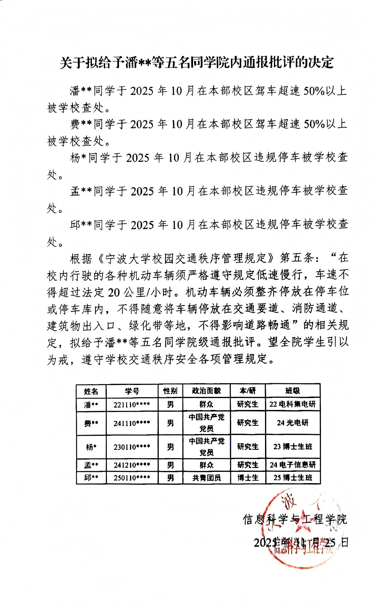 关于拟给予潘**等五名同色情网站内通报批评的决定